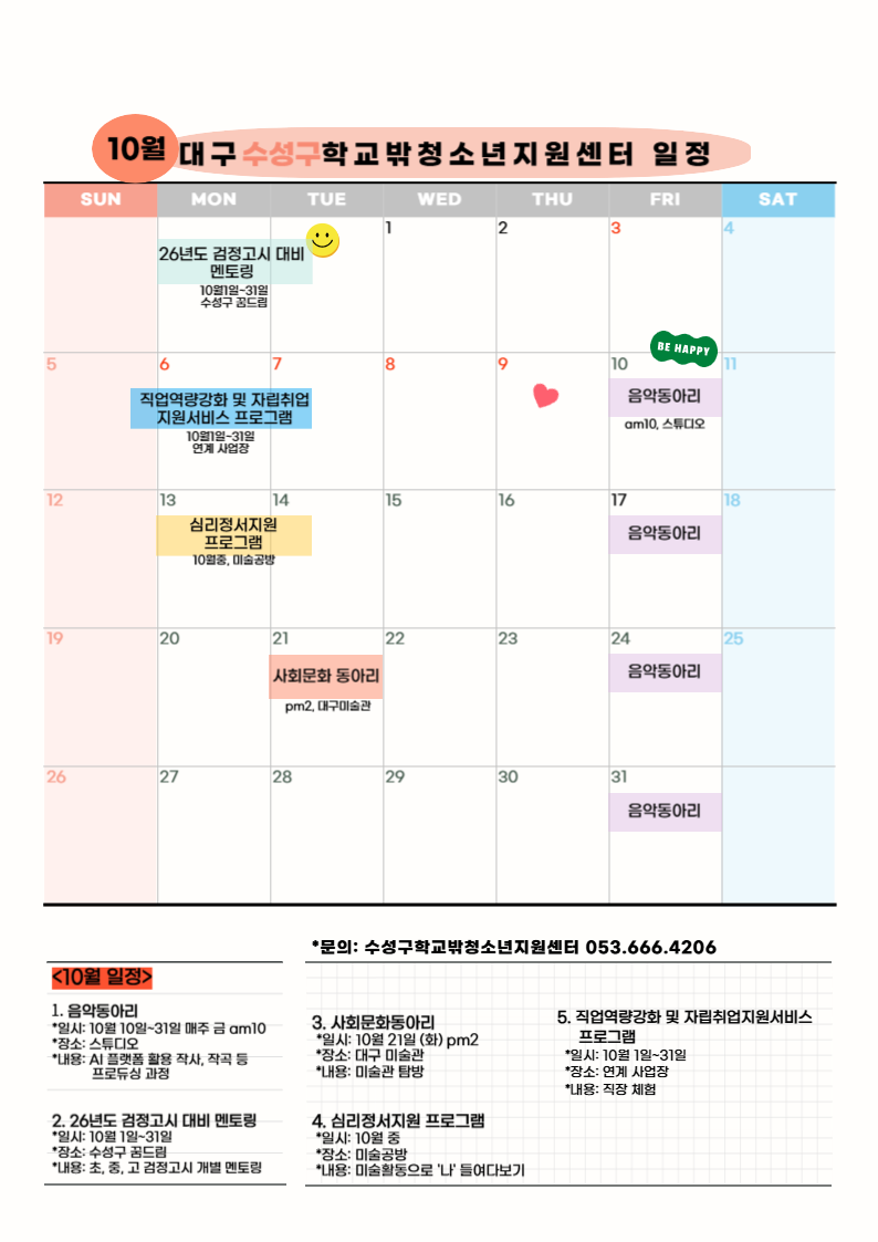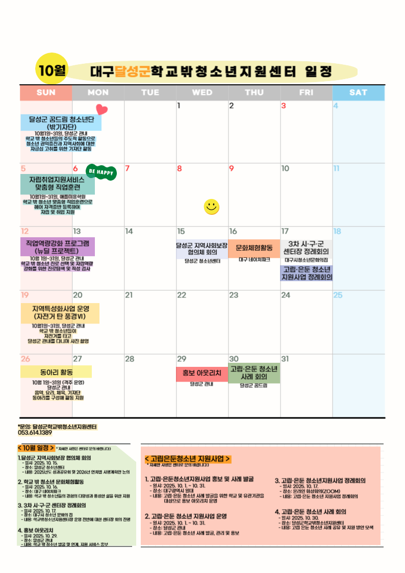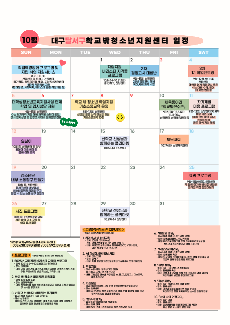 10월 북구, 수성구, 달서구, 달성군 학교밖청소년지원센터 일정입니다~